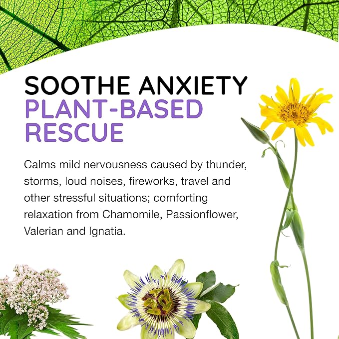 - PLANT-BASED RESCUE - Helps with mild nervousness caused by thunder, storms, loud noises, fireworks, travel and other stressful situations; comforting relaxation from chamomile, passionflower, valerian and ignatia.
