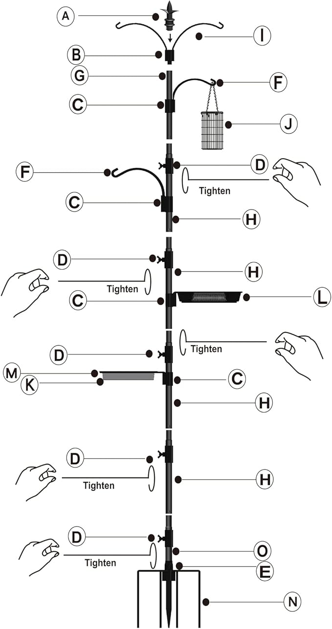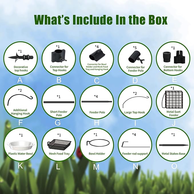 - Easy to Install: Need to assemble, please refer to the manual. Easily adjust components to any desired location by hand. No tools required! Forked metal stake base adds stability and permits easy placement. Large water dish & seed tray are easy to fill and clean.