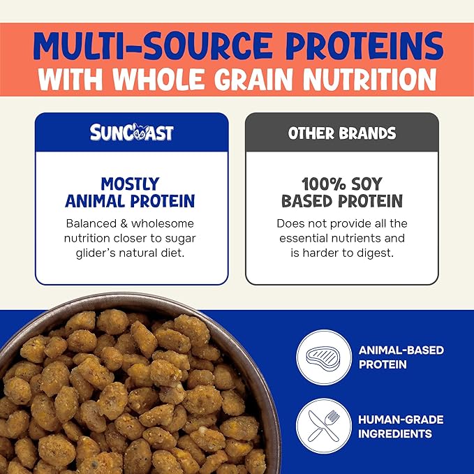 - TRUSTED BY OWNERS SINCE 1999: SunCoast Sugar Gliders has provided safe, vet-trusted sugar glider food for 20+ years. Proudly made with human-grade ingredients and carefully crafted for higher nutrients, less overeating.