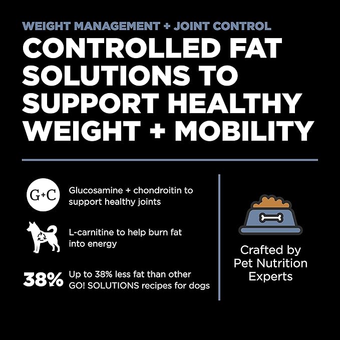 - Supports healthy weight + joints. With up to 38% less fat than other GO! SOLUTIONS recipes for dogs, plus L-carnitine to help burn fat and glucosamine + chondroitin to support healthy joints, this recipe can help your dog stay in great shape for life.