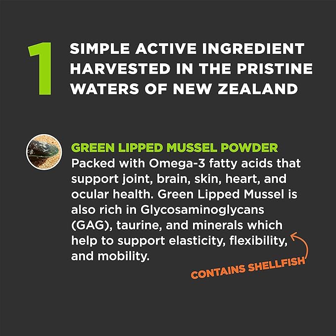- Cat and dog hip and joint supplement made with 1 active ingredient – green lipped mussel harvested from New Zealand; packed with Glycosaminoglycans (GAG), taurine and minerals to help support elasticity, flexibility and mobility