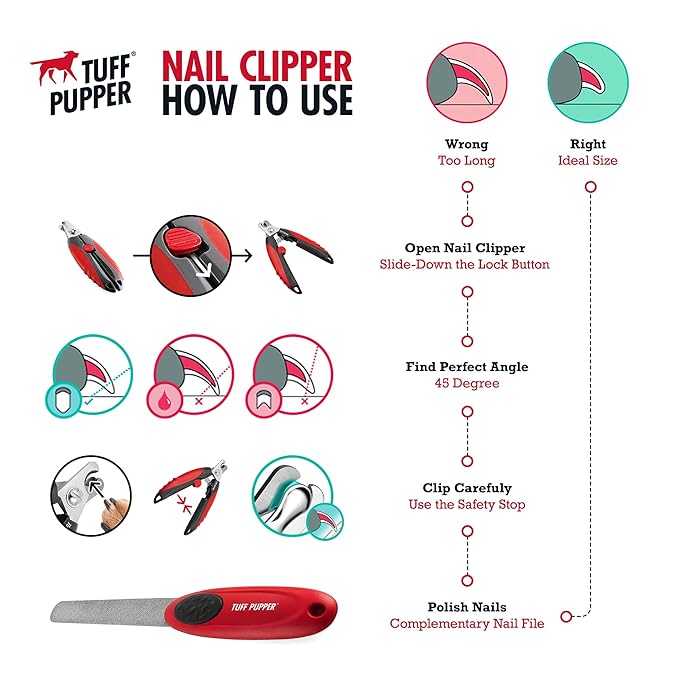 Tuff Pupper Dog Nail Clipper | Bonus Free Nail File | Razor Sharp Stainless Steel Blades | Protective Safety Guard Prevents Over-Cutting | Sturdy Non Slip Handles for Safe Grooming | Medium Large Dogs