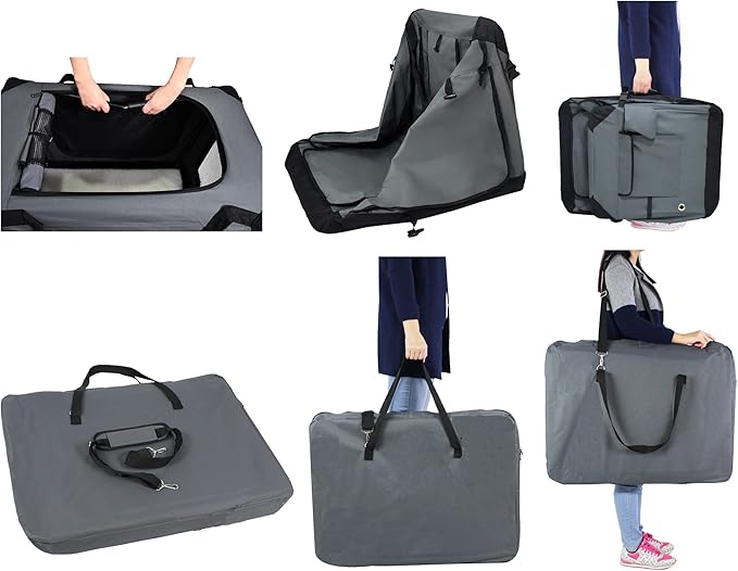 - The crate comes with a free carrying bag and fleece bed. The crate has a handle and hand carrying straps, while the carrying bag features both hand carrying straps and an adjustable padded shoulder strap, providing many carrying options. The crate can be folded down to a height of just 3 inches, making it easy to transport and store