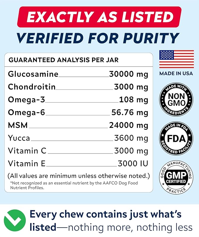 - American Quality Assurance: Our glucosamine for dogs is proudly made in the USA, ensuring top-quality care for your pets with 24/7 customer support. Rescue your puppy's joints with our delicious bites!
