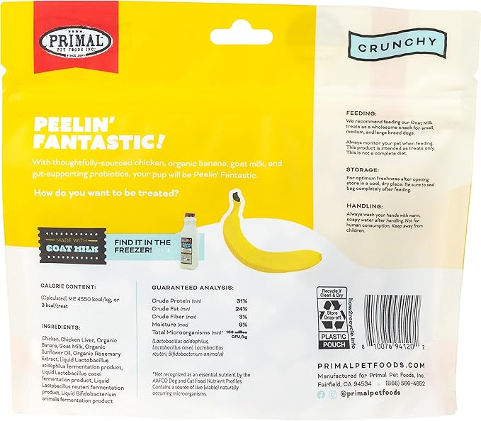 Primal Freeze Dried Dog Treats; Chicken & Banana Dog Treats with Goat Milk for Dogs, Peelin' Fantastic, Grain Free Training Treats for Dogs with Probiotics, 2 oz