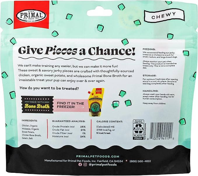 • Irresistible flavor dogs love. Our chicken dog treats are made with real Primal Bone Broth and organic sweet potato for dogs