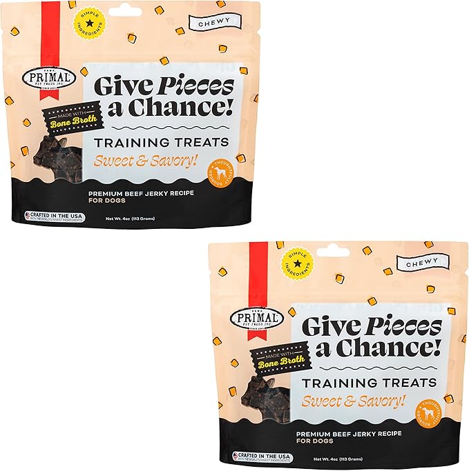 Primal Beef Jerky Dog Treats Made with Beef Bone Broth for Dogs, Give Pieces a Chance, Training Treat for Dogs, 4 oz (Pack of 2)