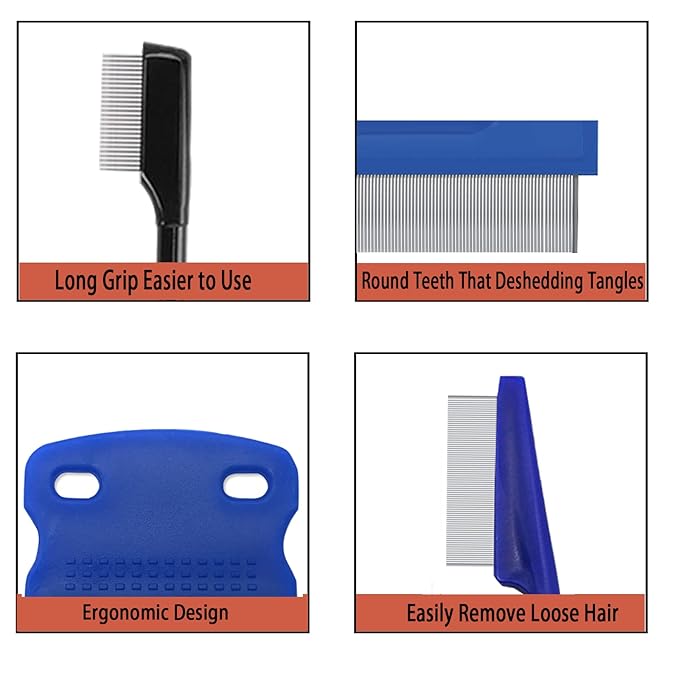 • Package include:2 metal teeth double hole combs,1 metal teeth long handle combs and 2 pieces long handle pet grooming combs, 5 pieces in total (colors as shown in picture)