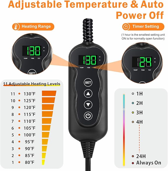 - 【24 Timer Option Pet Heating Pad】Pet heating pad has 24 timer option 1H-24H and Always (Default Setting). Our heating pad features Auto Shut Off timer functiomn, your heating pad will be powered off when arrives the setting time, conserve energy and prevent burns caused by excessive heating.