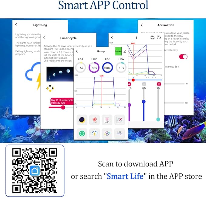 - 【Best Spectrum】Perfect blue/uv pop bloom color, suitable for all photosynthetic corals. acclimate your tank or new corals to the new light by using the "Acclimation" function