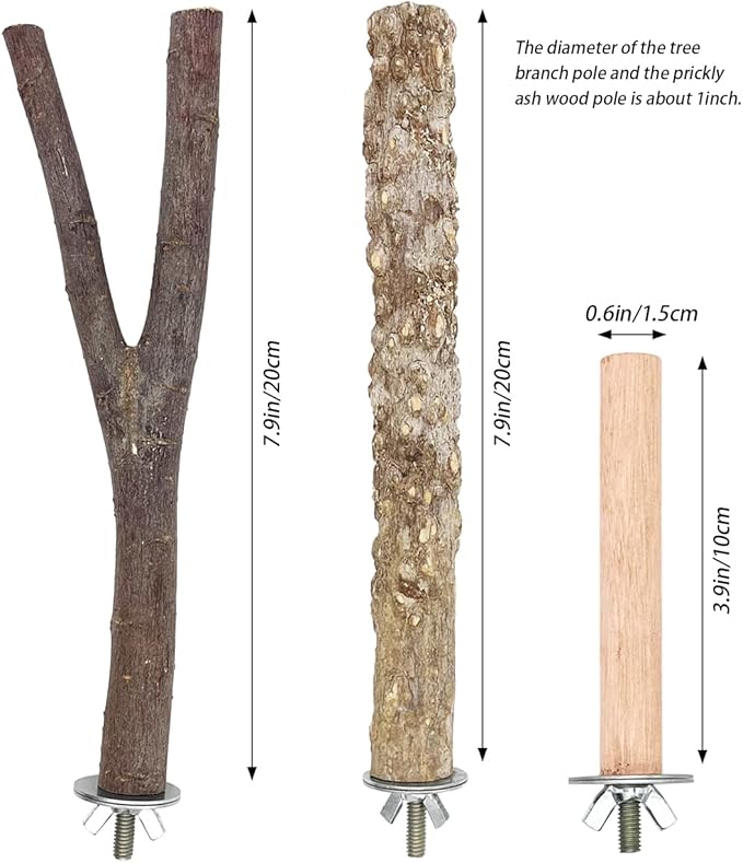 - Size Details:Comes with 3 different Types of bird perches for parakeets, pepper wood branch perch, prickly ash wood perch and smooth wood perch.The branch perch is recommend to small Animals,length is 7.9 inch, width is 5 inch.The wood perch is suitable for budgies, parakeets, conure love bird and other small bird.Length is 7.9 inch, thickness is 0.7 inch.Smooth bird perch size is 3.9 x 0.6inch.