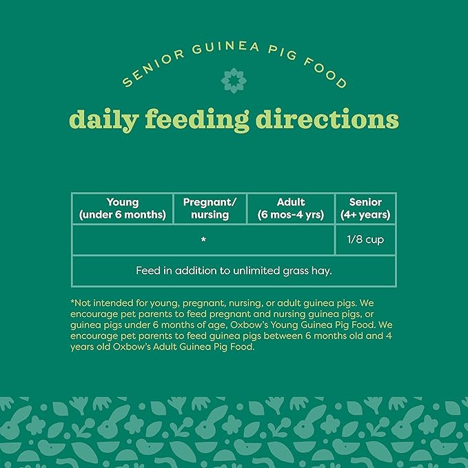 - VET-FORMULATED & MADE IN USA QUALITY: Oxbow Senior Guinea Pig is formulated with the guidance of leading vets and made with quality, wholesome ingredients. Our trusted senior guinea pig diet provides balanced nutrition and consistency for older pets.