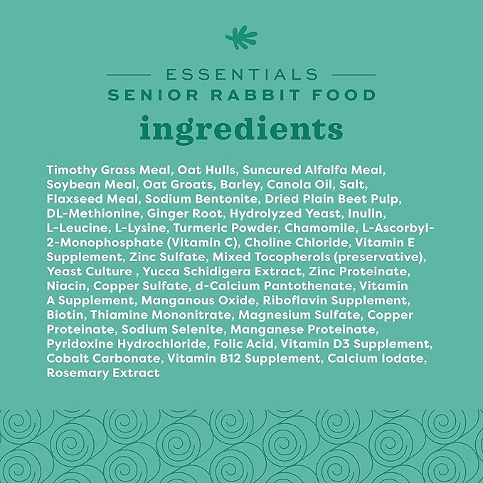 - SENIOR RABBIT FOOD: Unleash a new era of vitality for your senior rabbit with our Essentials Senior Rabbit Food; These rabbit pellets are expertly-formulated to support the unique physiological needs of senior rabbits