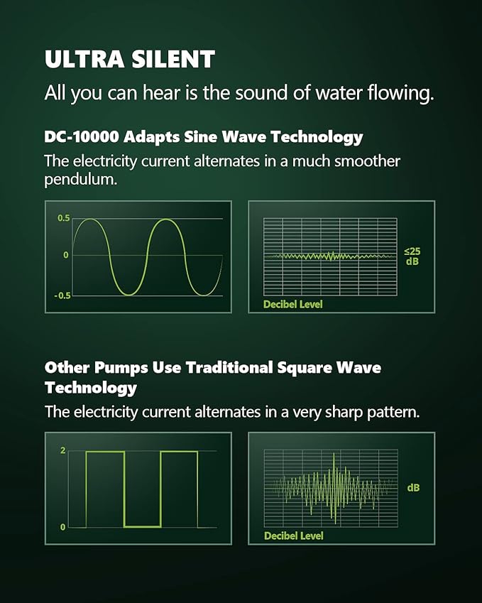 - Quiet: The electricity current of DC pumps alternate in a much smoother pendulum than other AC pumps. All you can hear is the sound of water flowing