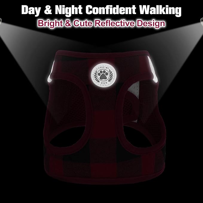 - _Comfortable and Reflective ---Adjustable dog harness features colorful plaid and breathable mesh fabric, comfortable to wear and will not stick to the dog_ hair. Reflective strips deign reflect ambient light in low light conditions, making you and your dog safer when walking and moving around at night without worrying about blurred vision in the dark.
