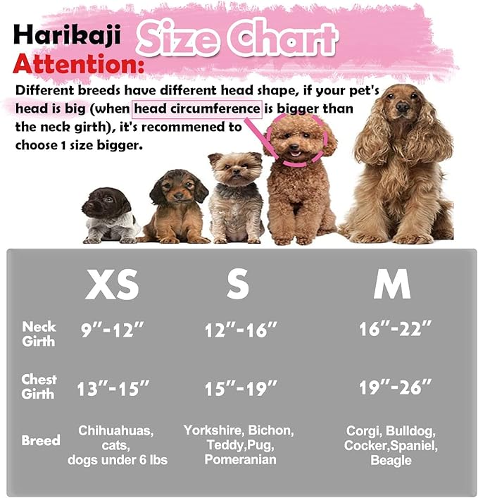 - 【FIT SIZE】XS:Neck Girth:9-12'',Chest Girth:13-15''.Suitable for small dog.Please measure your pet's size before purchasing.Different breeds have different head shape, if your lovely pet's head is big( when head circumference is bigger than the neck girth), it's recommened to choose 1 size bigger.