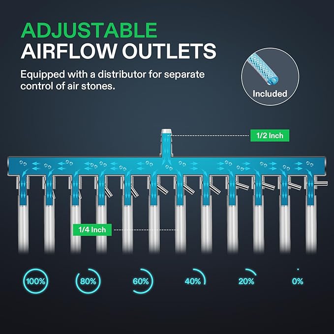 - Powerful Airflow: VIVOSUN's 55W electromagnetic motor delivers exceptional air pressure up to 0.035 MPa and a high volume of air through 12 adjustable valve outlets, compatible with 1/4" airlines