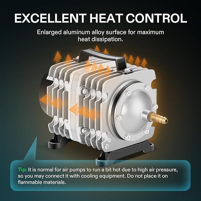 - Wide Applications: This commercial air pump is ideal for the oxygenation of aquariums, ponds, hydroponics, fish farms, and seafood restaurants