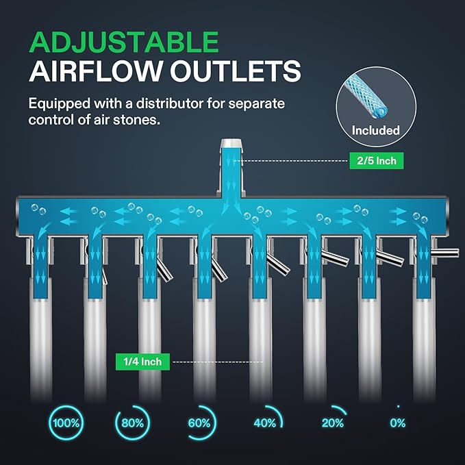 - Powerful Airflow: VIVOSUN's 40W electromagnetic motor delivers exceptional air pressure up to 0.03 MPa and a high volume of air through 8 adjustable valve outlets, compatible with 1/4" airlines
