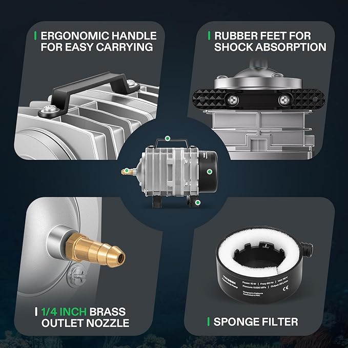 - Quiet Operation: Oil-free lubrication and low noise (under 60 dB), makes it an ideal choice for peaceful oxygenation in aquariums and hydroponic systems