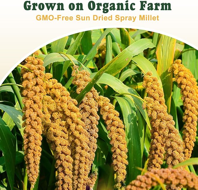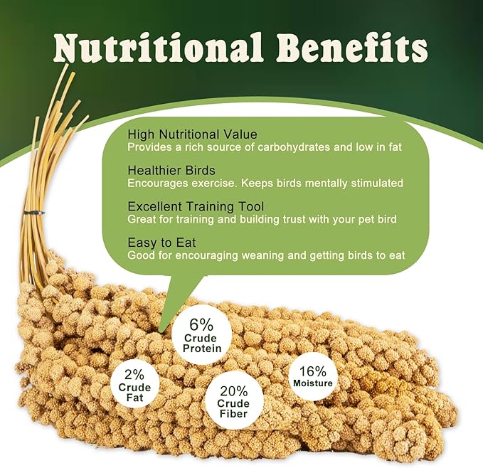 - Wholesome & Nutritious with Easy Feeding: Made from premium, handpicked millet, our millet spray is a rich source of carbohydrates and low in fat. Feed your birds 1-2 sprays daily as a supplement to their regular diet. Simply place the spray inside the cage, on the floor, or attached to a clip, allowing birds to forage and enjoy naturally. Always ensure fresh, clean water is available.