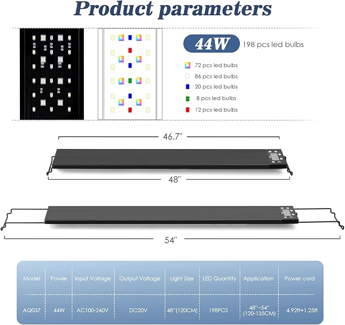 - Multifunctional 24/7 Professional Aquarium Light: Made of thickened aluminum alloy material, quick heat radiation, durable; Choosed 2835 and 5730 beads, high brightness, color rendering up to 89; Light bead panel is fully covered with glue, good waterproof performance; The retractable bracket is suitable for all fish tanks with a length of 12"-54"; Input votage is AC100-240V, Kelvin is 6500K white LED; LED high-definition screen, controller and lamp integrated and wires no longer messy