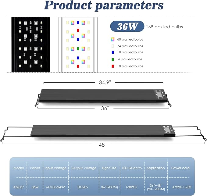 - Multifunctional 24/7 Professional Aquarium Light: Made of thickened aluminum alloy material, quick heat radiation, durable; Choosed 2835 and 5730 beads, high brightness, color rendering up to 89; Light bead panel is fully covered with glue, good waterproof performance; The retractable bracket is suitable for all fish tanks with a length of 12"-54"; Input votage is AC100-240V, Kelvin is 6500K white LED; LED high-definition screen, controller and lamp integrated and wires no longer messy