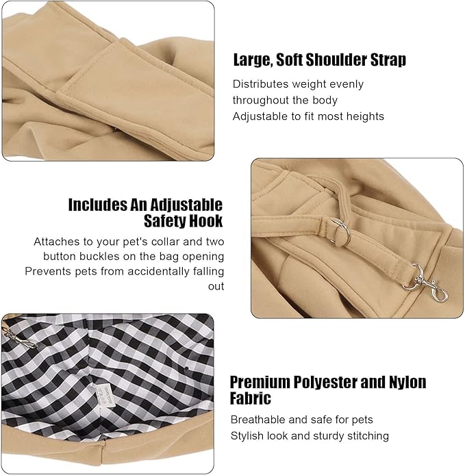 - Safety Design: Pet shoulder carrying bag includes an adjustable safety hook that attaches to your pet's collar and two push button buckles on the bag opening to prevent your pet from accidentally dropping it.