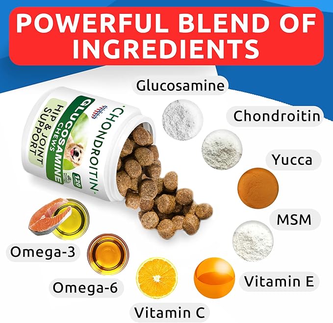 - Vet-Approved Formula: With glucosamine, chondroitin, MSM sulfate & Omega-3-6, our dog hip and joint supplement is the best natural support for your buddy's mobility. Plus, these bites extend the benefits to your pup's flexibility and comfort.