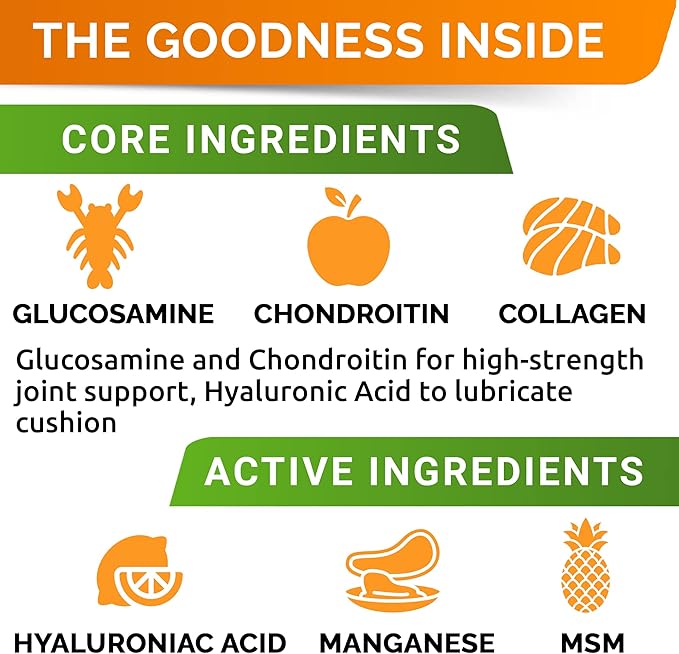 - Natural Premium Ingredients - each spoon of our liquid supplement contains a complex of Glucosamine, Chondroitin, MSM, Manganese, Collagen, Hyaluronic Acid among active ingredients for joint support for dogs, strong bones, improve doggy's energy and mobility.