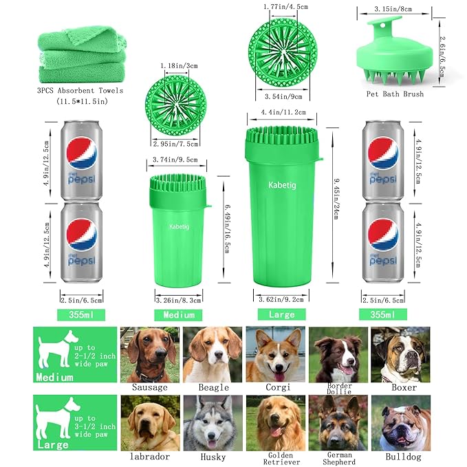 - 【 PROFECT SIZE & FREINDLY DESIGN】As paw washer for large dogs, it is perfectly sized for 1.8-3.3 in wide paws. the cup of the dog foot cleaner adopts no-slip grooves design. It 's made of food grade PP material. The bristle inside and the round-top brush is made of silicon material. they are gentle, tough , elastic , not hurt your pets.