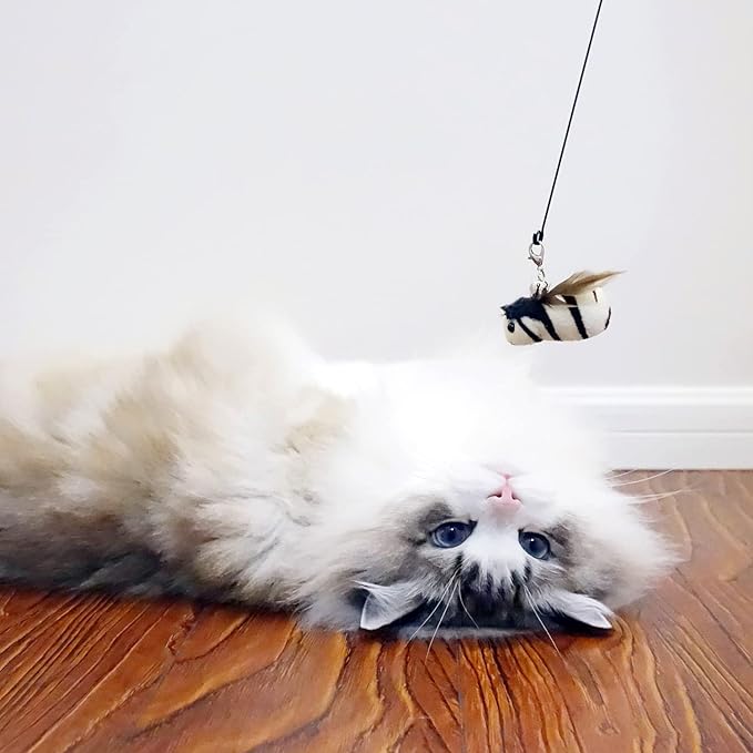• 【Creative design】4 feather toys use 3 kinds of small animals that can fly: bird, wasp, cicada, they make cats full of curiosity. Swing the feather "bait" to get the cat excited, trigger the "hunting instinct", let them run and jump like wild animals, and make your cat go crazy with joy!