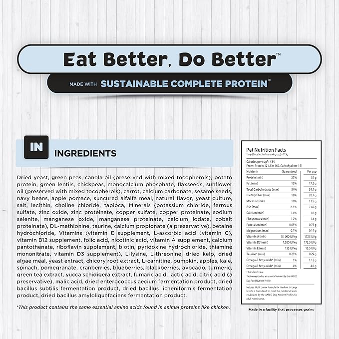 - SUSTAINABLE COMPLETE PROTEIN – Our primary source of protein is a plant-based, dry yeast that provides all essential amino acids and nutrients, similar to animal proteins found in chicken, making it a top choice for vegan dog food and dry dog food options. This eco-friendly protein emits significantly less CO2 than traditional meat sources, supporting a more sustainable, plant-based diet for puppies.