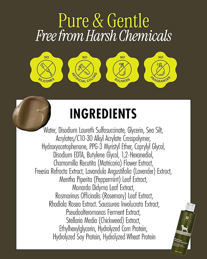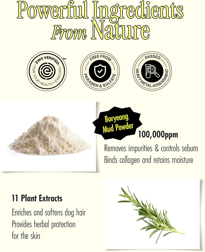 - CHEMICAL-FREE PREMIUM QUALITY: Our premium dog shampoo is made with the finest ingredients, free from parabens, sulfates, alcohol, and soap. This EWG all-green grade mild mud pack shampoo is made of 96.24% natural ingredients that protect your dog's sensitive skin. Our dog shampoo does not contain artificial fragrances, allowing your pets to adapt quickly.