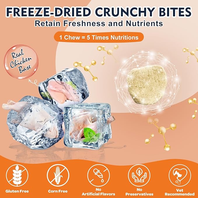 - Freeze-Dried Chicken Flavor Chew: Our dog hip and joint supplement are based on natural chicken, they act more like treats for your pup. Advanced freeze-dried technology removes the moisture to retain nutrients and flavor, it's crunchy so even picky eaters will love it. No wheat, corn, soy, or artificial fillers, and vet recommended. You can add it to furry babies' daily diet without worry. Just give the bite directly or crumble it in food.