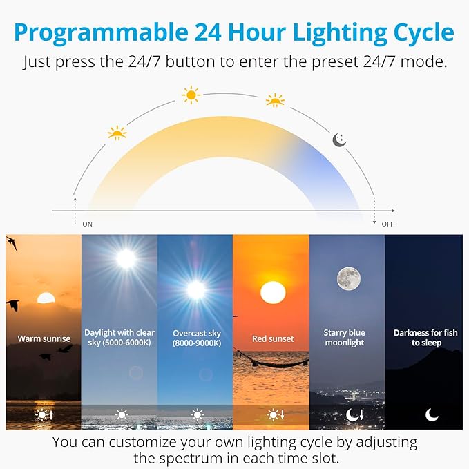 • EASY-TO-USE 24/7 MODE: The fish tank light can perfectly simulate the natural 24-hour cycle of sunlight. Just press a button, hands-free simulating fire red sunrise to blue starry night