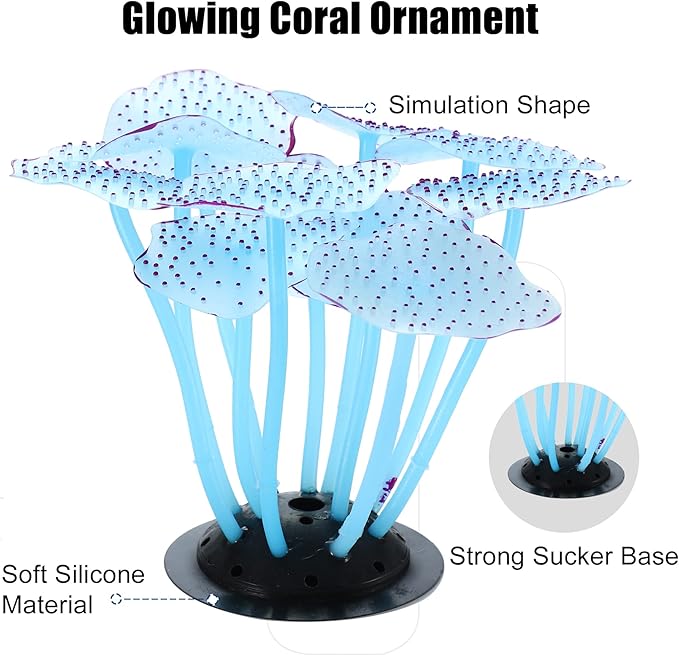 VOCOSTE Soft Silicone Glowing Aquarium Mushroom Coral, Fluorescence Aquatic Artificial Coral for Fish Tank Decoration, Blue