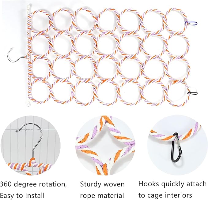- For Most Pets: This bird climbing rope net is for many small animals, such as rats, sugar glider, birds, parrots, parakeet, cockatiel, cockatoo, conure,mini maca and so on to stand, climb and play. It is good decoration and accessory for small animal cage