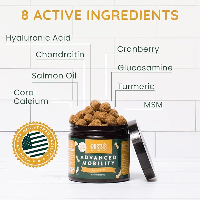 - PREMIUM PET SUPPLEMENT- MADE IN USA - Rusty's Pet Essentials treats contain a powerful blend that supports your dog's hips and joints so he or she can live a healthy, happy, and energetic life. It is made in the United States from natural and safe ingredients in FDA-registered and GMP-certified facilities.