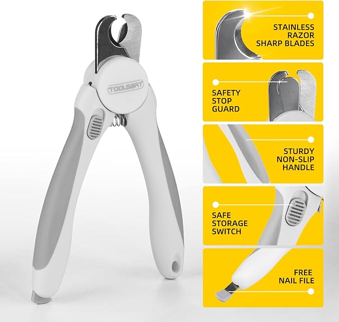 - 🐦Pets Nail Clippers with Safety Guard: The clipper is sturdy and well-made with sharp blades, features a safety stop for guidance, and comes with a free hidden nail file stored in the handle to polish sharp nails and details. The nail clippers have a non-slip grip that allows you to hold them securely, and it has a tension spring that pushes them open after each cut, making the process go faster and more silent. Unlock protection prevents children from using it.