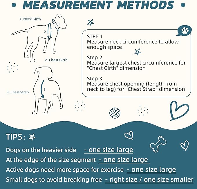 - [3 Sizes Option] No Pull dog harness and leash set are available in 3 sizes. Please measure your dog carefully according to the size chart before placing an order to ensure the collar fits your dog. Please leave room for your dog to rest, eat and chew