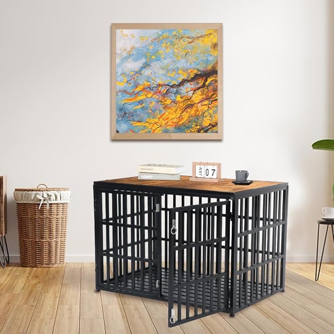 - Multi-Function Wooden Dog Kennel: Heavy duty steel tubes combined with wood style furniture dog crate. This dog kennel furniture provides space for your dog to rest. It is also a casual chic end table. You can put magazines; shelves; table lamps on the top board. Furniture dog crate can be placed in your bedroom; living room; corner