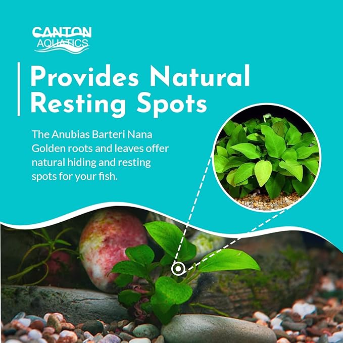 - NATURAL RESTING PLACES: The Anubias Barteri Nana Golden roots and leaves offer natural hiding and resting spots for your fish. These plants provide a natural and secure environment for all aquatic inhabitants.