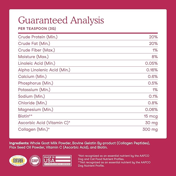 - Cat and dog skin care: Fera’s Skin & Coat goat milk topper contains collagen powder, biotin, vitamin C, plus full cream goat milk for easy digestion; our skin and coat supplement for dogs and cats also helps with coat thickness and shine