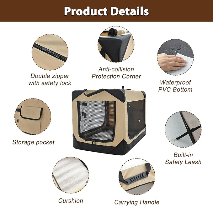 - Stable Structure: The foldable crate is made with a sturdy steel frame and high-quality waterproof Oxford fabric, ensuring that your pet is safe and secure while inside. The mesh windows allow for ventilation, while the zippered door makes it easy to access your pet.