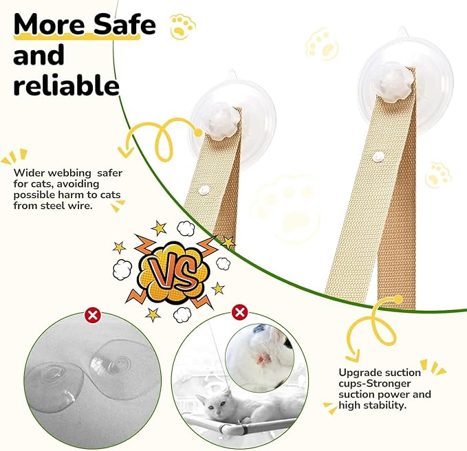 - Safe and Stable - Cat window perch can hold large cats up to 40lbs. Complete installation accessories. The cat window perch adopts a smooth solid wood frame and thick Oxford seat, and enhanced with 4 strong suction cups and 2 sturdy ropes, so the cat window perch is very stable. Cat window beds can be stably installed on the window, cat window hammocks can withstand the jumping and any activities of your cats
