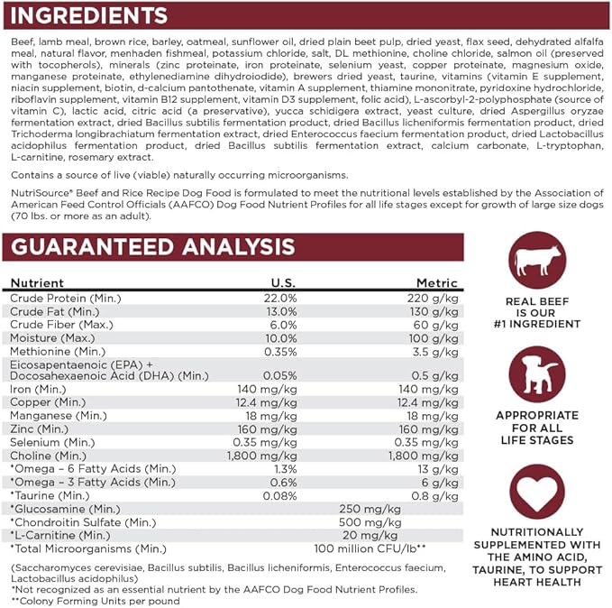 • As a member of our grain inclusive series, NutriSource Beef and Rice Dry Dog Food is formulated to meet AAFCO guidelines for all lifestages