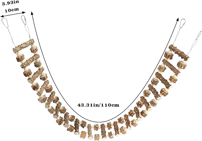 - Easy to Install: The length of this bird ladder toy is about 43.31"/110 cm, and the weight is about 1.5 lb/0.7 Kg. There are two metal buckles at each end, which can be easily and safely installed anywhere. Our small animal bending bridge is not only suitable for all kinds of small animal cage accessories but also suitable for hanging in the garden woods for birds, squirrels, and other small animals to play and stand.