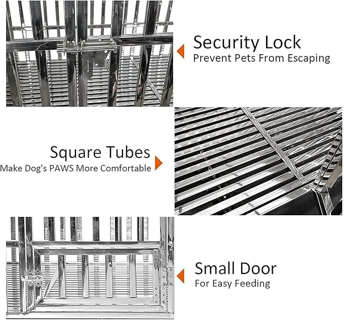 - Heavy Duty Stainless Steel Dog Crate Cage Indestructible and durable, hard to be damaged, surface safety keep your dog health, No one wants their dog to be at risk of chewing paint, and I'm sure neither do you.Suitable for most medium and large dogs, two locks with the safety buckles to prevent the high anxiety dogs from opening the door and escaping.Much stronger than fine wire cages. This is a very sturdy large dog cage, even for strong, powerful and aggressive dogs.