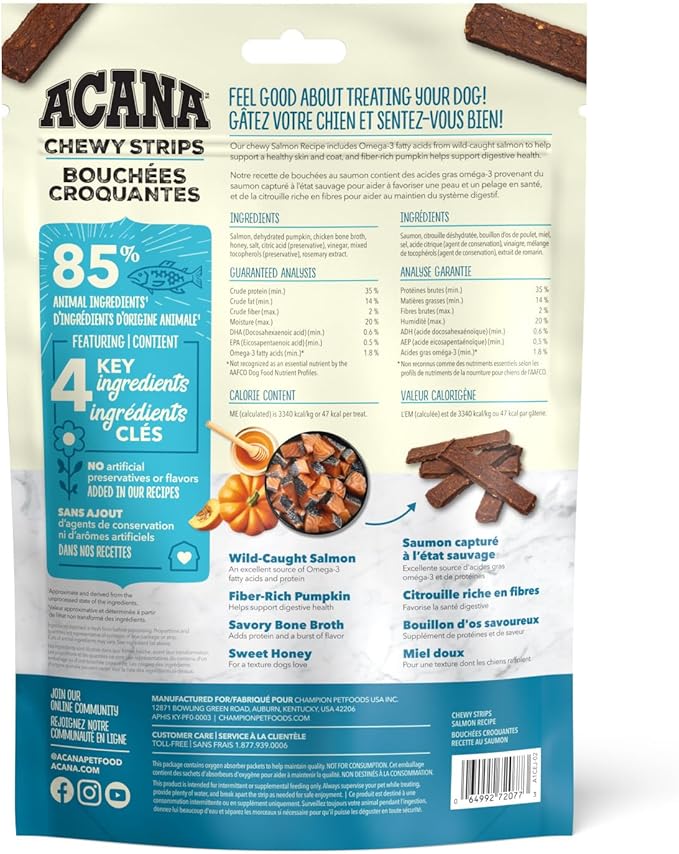 • One (1) 4 oz bag of ACANA Chewy Strips Salmon Dog Treats